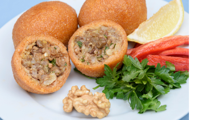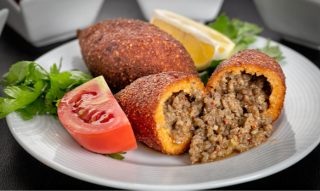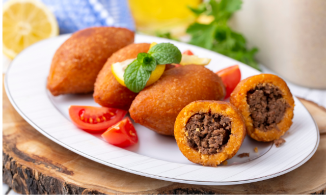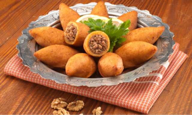 frittierte Bulgur-Fleischtaschen, gefüllt mit Rinderhack und Zwiebeln, dazu